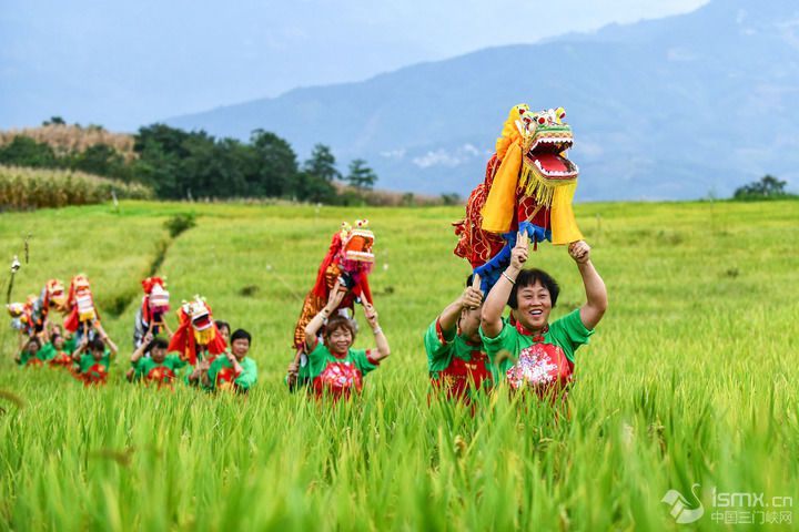 在云南省紅河哈尼族彝族自治州個(gè)舊市卡房鎮(zhèn)的旱地優(yōu)質(zhì)稻種植示范區(qū),群眾抬著板凳龍?jiān)谔镩g穿行迎接豐收季的到來(2024年9月20日攝)。新華社記者 王靜頤 攝