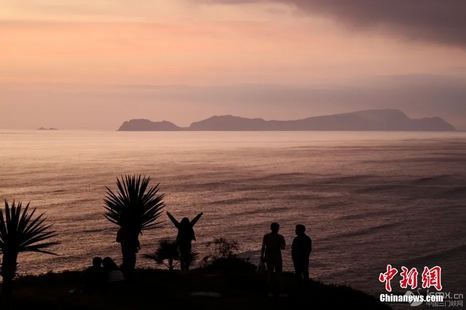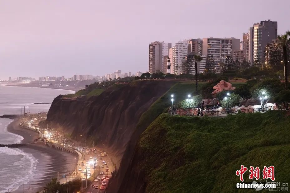 當(dāng)?shù)貢r間11月12日,秘魯首都利馬,日落時分的海岸線美景。中新社記者 盛佳鵬 攝