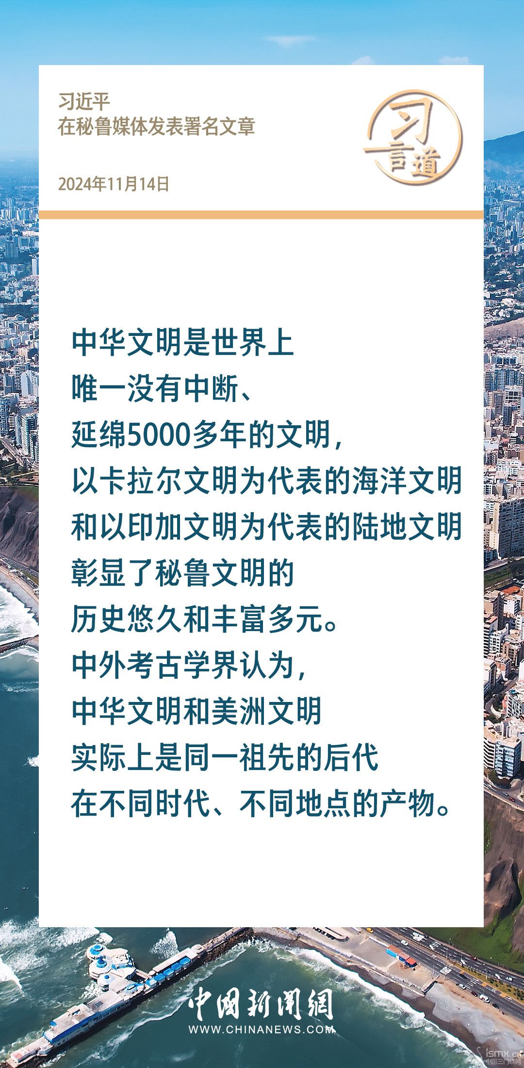 當?shù)貢r間11月14日,在赴利馬對秘魯進行國事訪問并出席亞太經(jīng)合組織第三十一次領導人非正式會議之際,國家主席習近平在《秘魯人報》發(fā)表題為《讓中秘友好之船揚帆遠航》的署名文章。