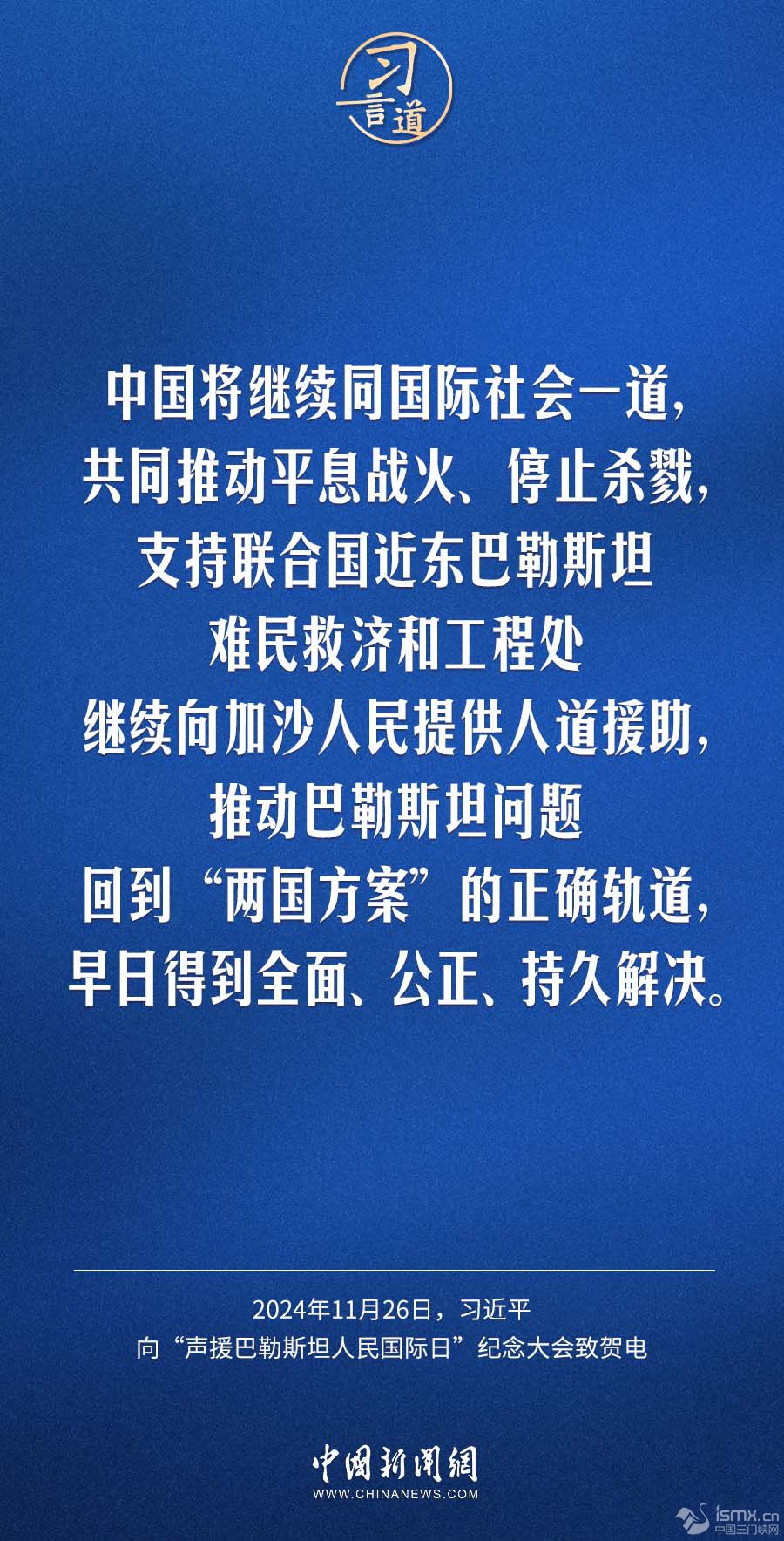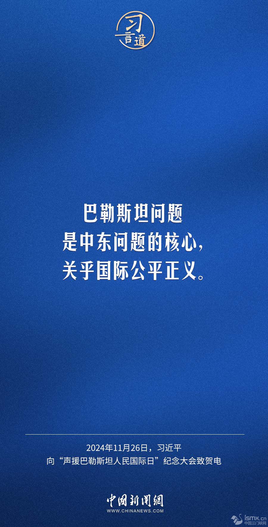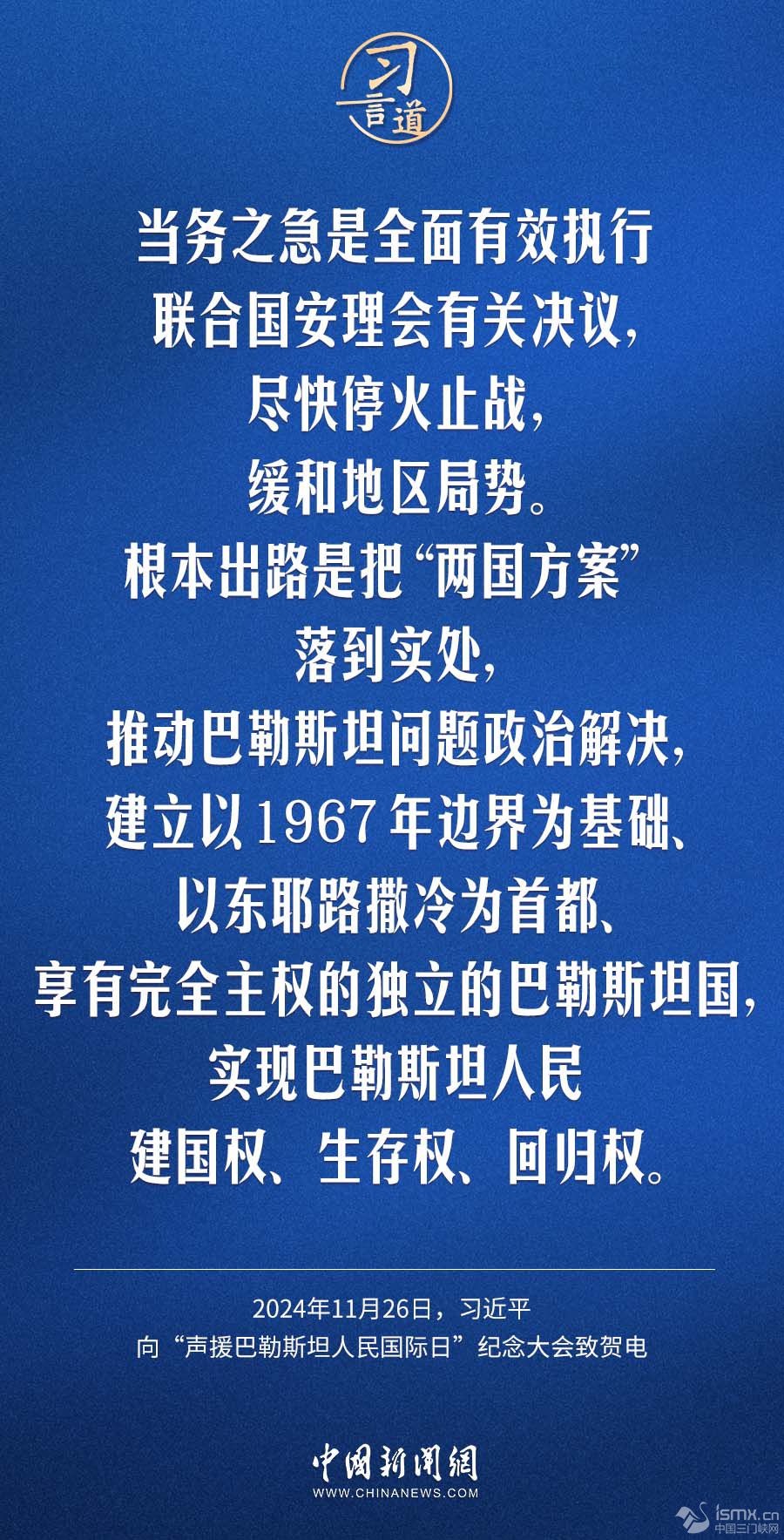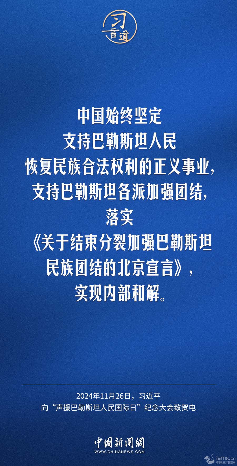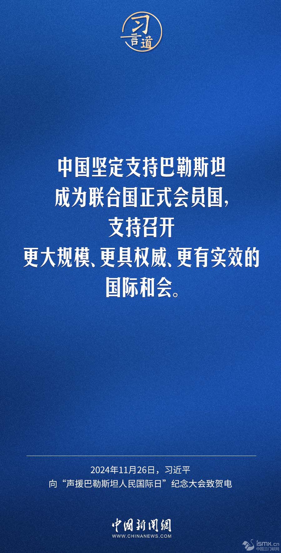 11月26日,聯(lián)合國舉行“聲援巴勒斯坦人民國際日”紀念大會,國家主席習(xí)近平向大會致賀電。習(xí)近平指出——