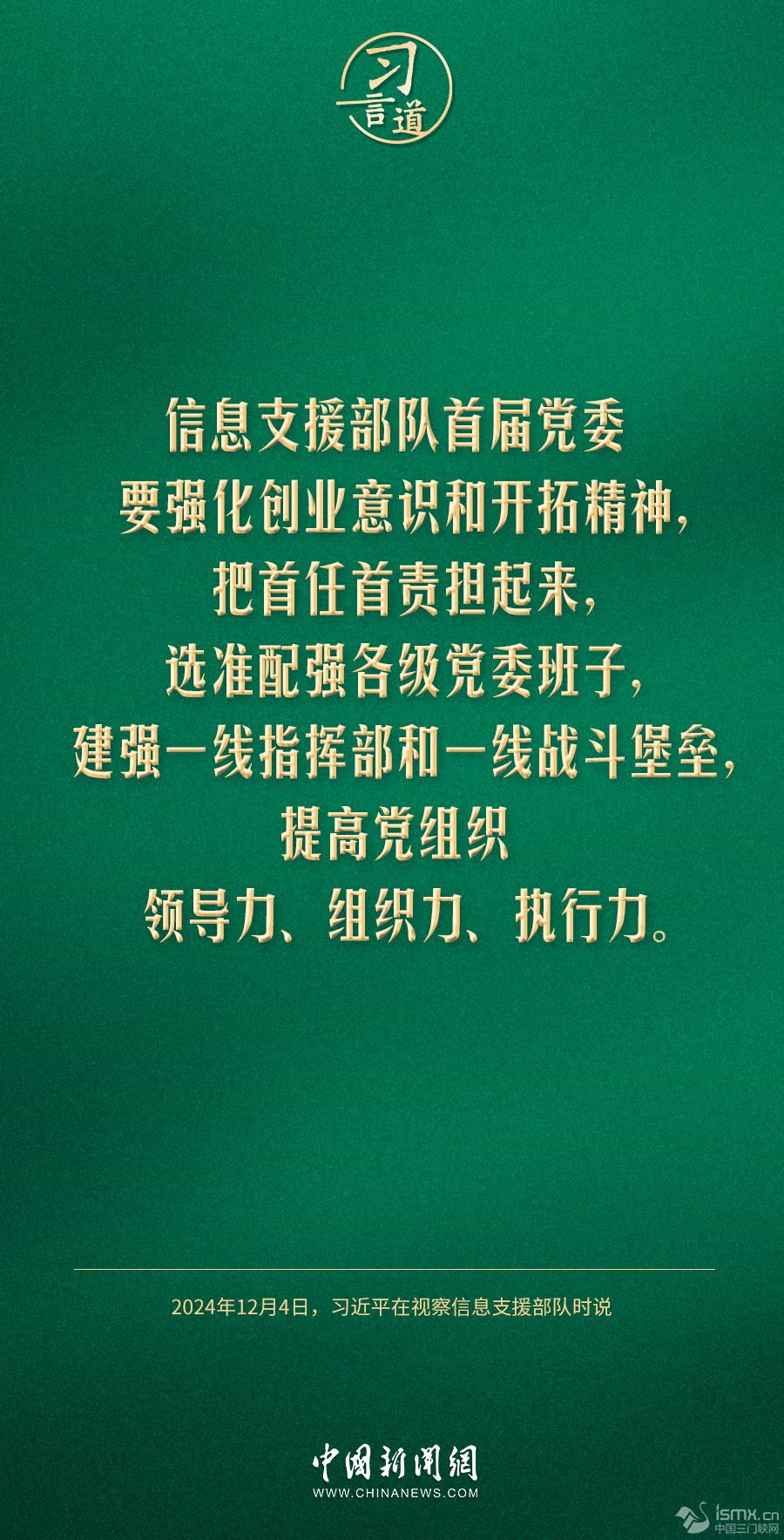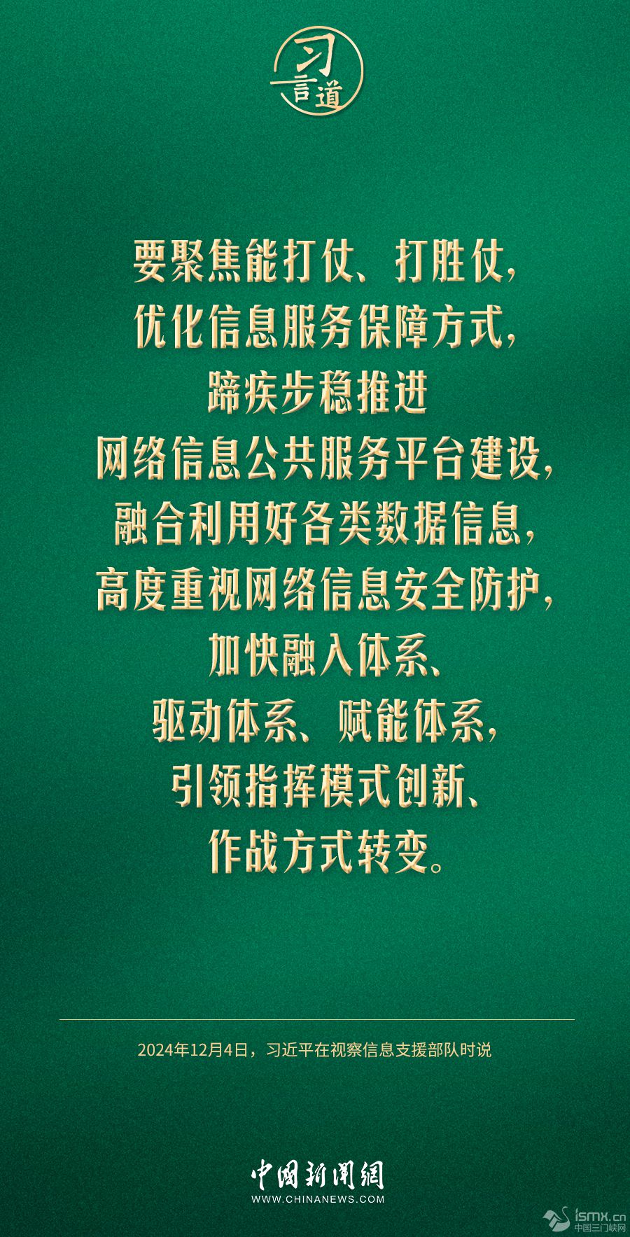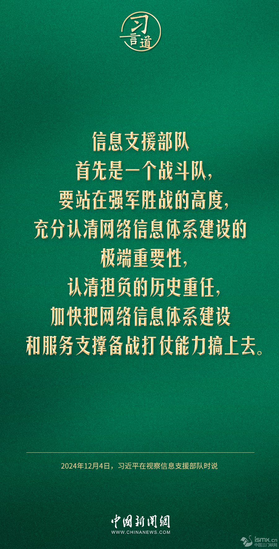 中共中央總書記、國(guó)家主席、中央軍委主席習(xí)近平4日視察信息支援部隊(duì),代表黨中央和中央軍委,對(duì)信息支援部隊(duì)第一次黨代表大會(huì)的召開表示熱烈祝賀,向信息支援部隊(duì)全體官兵致以誠摯問候。習(xí)近平指出——