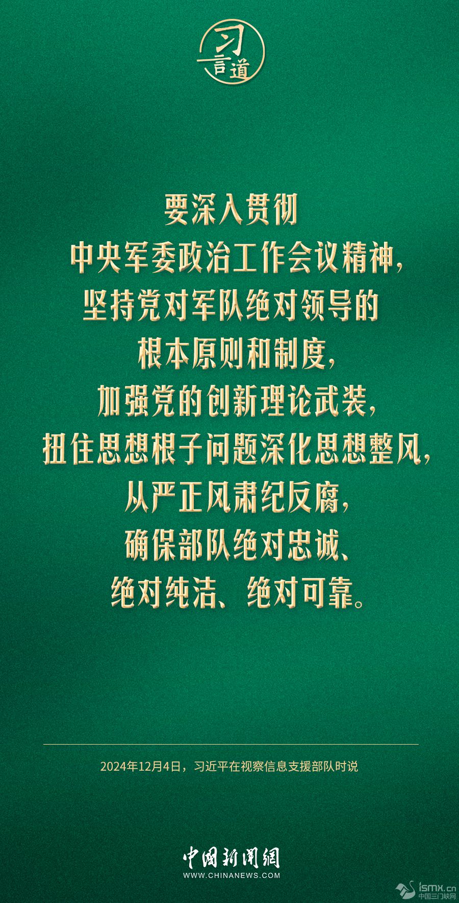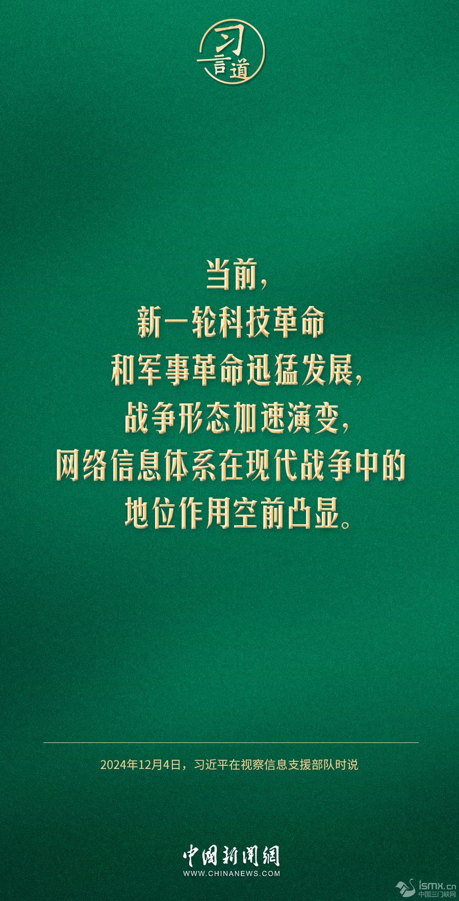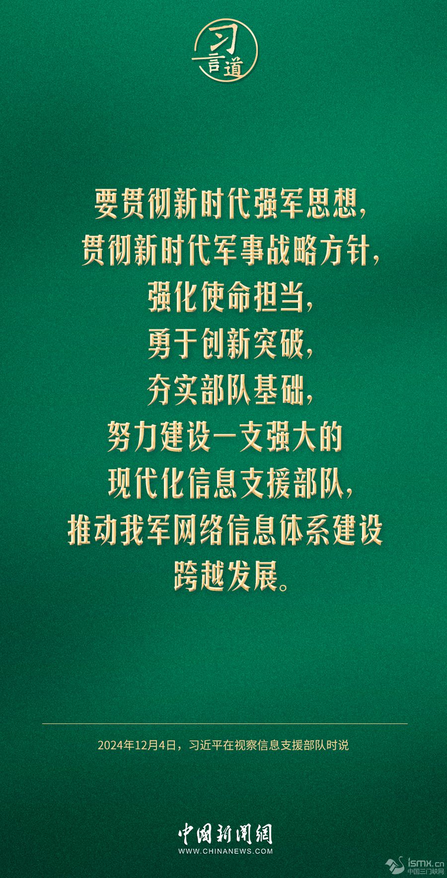中共中央總書記、國(guó)家主席、中央軍委主席習(xí)近平4日視察信息支援部隊(duì),代表黨中央和中央軍委,對(duì)信息支援部隊(duì)第一次黨代表大會(huì)的召開表示熱烈祝賀,向信息支援部隊(duì)全體官兵致以誠摯問候。習(xí)近平指出——
