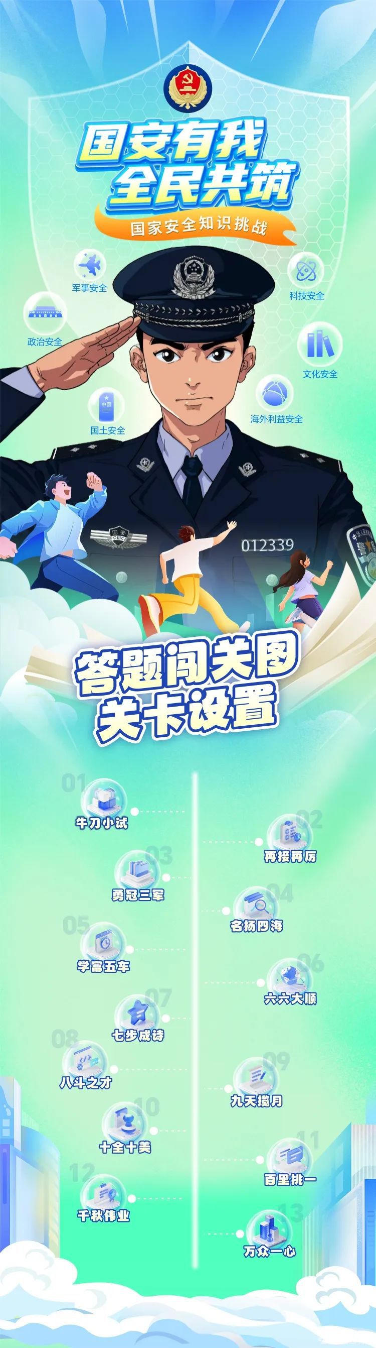 為熱烈慶祝中華人民共和國成立75周年,進(jìn)一步增強(qiáng)人民群眾對國家安全工作的了解,國家安全部官方微信公眾號舉辦此次“國安有我全民共筑”國家安全知識挑戰(zhàn)活動;顒又忻總人都將化身“國安小衛(wèi)士”,運(yùn)用所掌握的總體國家安全觀、國家安全法律法規(guī)等知識,闖過一道道關(guān)卡,不斷提升維護(hù)國家安全的能力和本領(lǐng),更有機(jī)會獲得精美禮品!