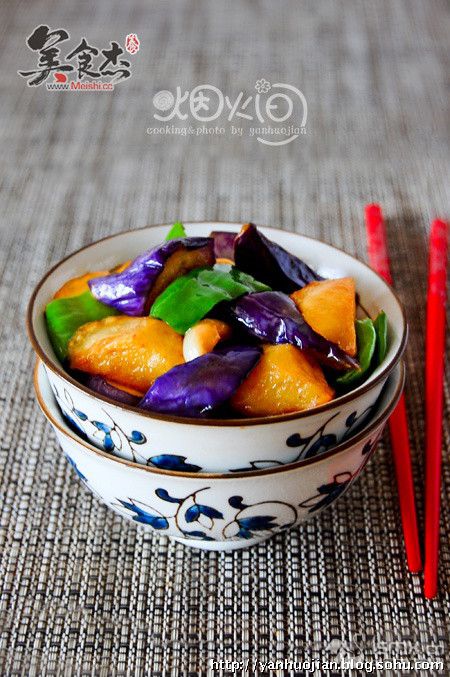 1 茄子洗凈后去蒂,帶皮切滾刀塊;土豆去皮切滾刀塊;青椒去蒂去籽后切成大塊;大蔥切末、大蒜拍碎備用 2 鍋中倒入一些油,大火加熱至8成熱時,分次將土豆和茄子塊炸成金黃色熟透后撈出,青椒過油斷生后立