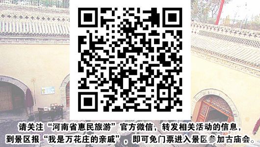 請關(guān)注“河南省惠民旅游”官方微信,轉(zhuǎn)發(fā)相關(guān)活動的信息,到景區(qū)報(bào)“我是萬花莊的親戚”,即可免門票進(jìn)入景區(qū)參加古廟會。